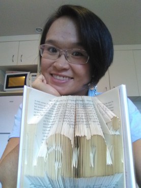 Món quà thứ hai tôi muốn cũng không ai đoán được và chỉ tốn một đô. Cuối tuần trước tôi đi Newtown festival gặp một cô tên Karen ở thư viện. Cô đang gấp sách cũ thành các hình thù khác nhau mà không hề làm ảnh hưởng gì đến sách, chỉ là các nếp gấp tạo hình. Tôi “tầm sư học đạo” ngay lập tức. Sau một tuần gấp các hình khác nhau, thì tôi nhờ cô dạy cách gấp chữ tên tôi và thành thật rằng tôi muốn gấp chữ theo tên để tặng mình dịp sinh nhật. Không có nhiều thời gian, nên cô chỉ dạy phương pháp. Tôi muốn thì phải tự dành thời gian và công sức tự làm ở nhà. Tôi đã làm và đây là thành quả :))