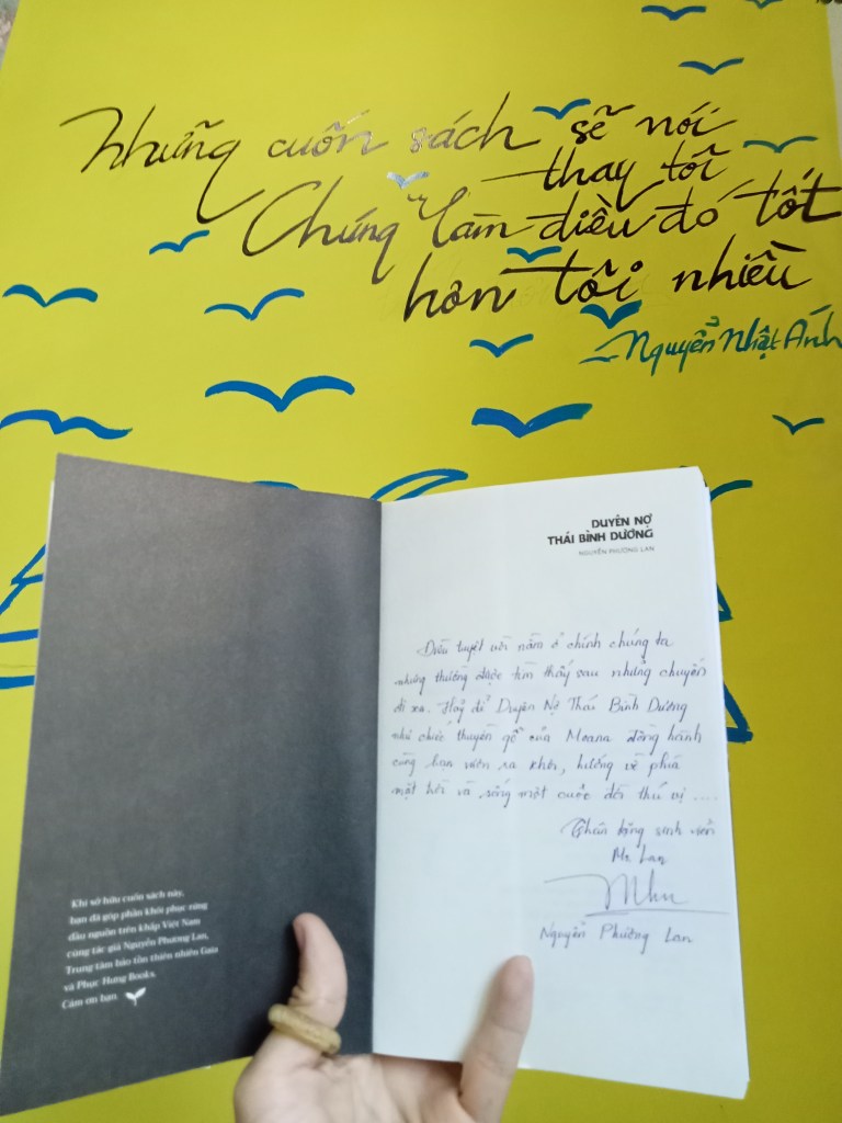 Nắng viết sách để…mua lại sách và gởi tặng các bạn sinh viên của Nắng kèm thông điệp xuyên suốt như thế này: “Điều tuyệt vời nằm ở chính chúng ta nhưng thường được tìm thấy sau những chuyến đi xa. Hãy để Duyên Nợ Thái Bình Dương như chiếc thuyền gỗ của Moana đồng hành cùng bạn vươn ra khơi, hướng về phía mặt trời và sống một cuộc đời thú vị…”.