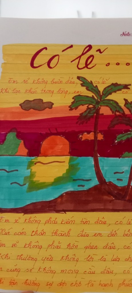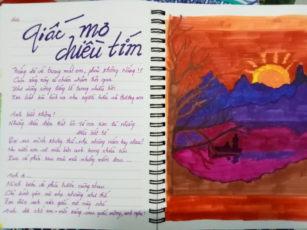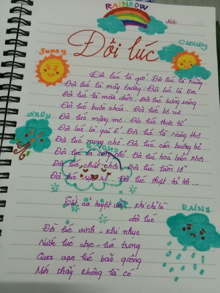 Ngoài lề chút là tuần rồi Nắng tham gia khóa học viết văn, được tiếp cận với khái niệm “Văn học sinh thái” – một khía cạnh trong concept khổng lồ đó khuyến khích những người viết không xuất bản sách giấy để bảo vệ những cánh rừng. Đây cũng là lý do khiến một đứa “low-tech” như Nắng quyết định “xuất bản” tập thơ trên mạng xã hội. Hầu hết các bài thơ cũng được Nắng cẩn thận chép tay vào một cuốn sổ kèm với những hình minh họa ngây ngô của Nắng cho thêm sắc màu cuộc sống. Các bạn đọc tập thơ “độc bản” này của Nắng nhé và có thể thoải mái cho Nắng biết các bạn thích bài nào, không thích bài nào, góp ý ra sao, Nắng sẽ luôn luôn lắng nghe vì Thơ với Nắng là ngôn ngữ để sẻ chia và thấu cảm <3. Vậy thôi! Nắng hông sống bằng thơ hay viết mà Nắng chỉ muốn sống một cách có chất thơ nên các bạn góp ý gì thì Nắng nhặt ý nấy với thật nhiều yêu thương và cảm kích<3