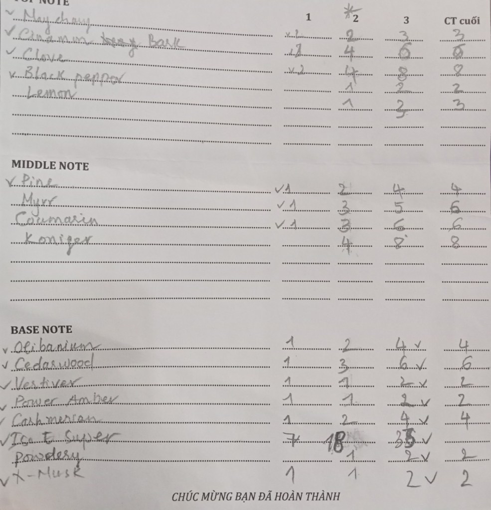Các nốt hương một lần nữa nhờ có concept rõ ràng định hướng mà hòa quyện vào nhau tạo nên một mùi hương mùa đông không hề lạnh lẽo mà trầm ấm với tầng hương cuối có gỗ đàn hương, hổ phách cộng hưởng với chút cay nồng của quế và đinh hương ở tầng hương đầu. Tầng hương giữa đóng vai trò trái tim hồng sưởi ấm mùa đông với nốt hương quả thông (Konifer), pine và Myrr- một loại nhựa cây có màu nâu đỏ, mùi gỗ nồng ấm.