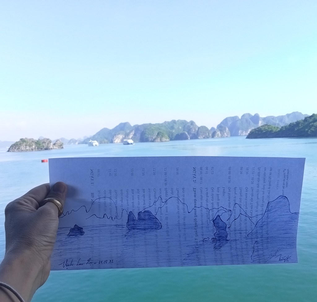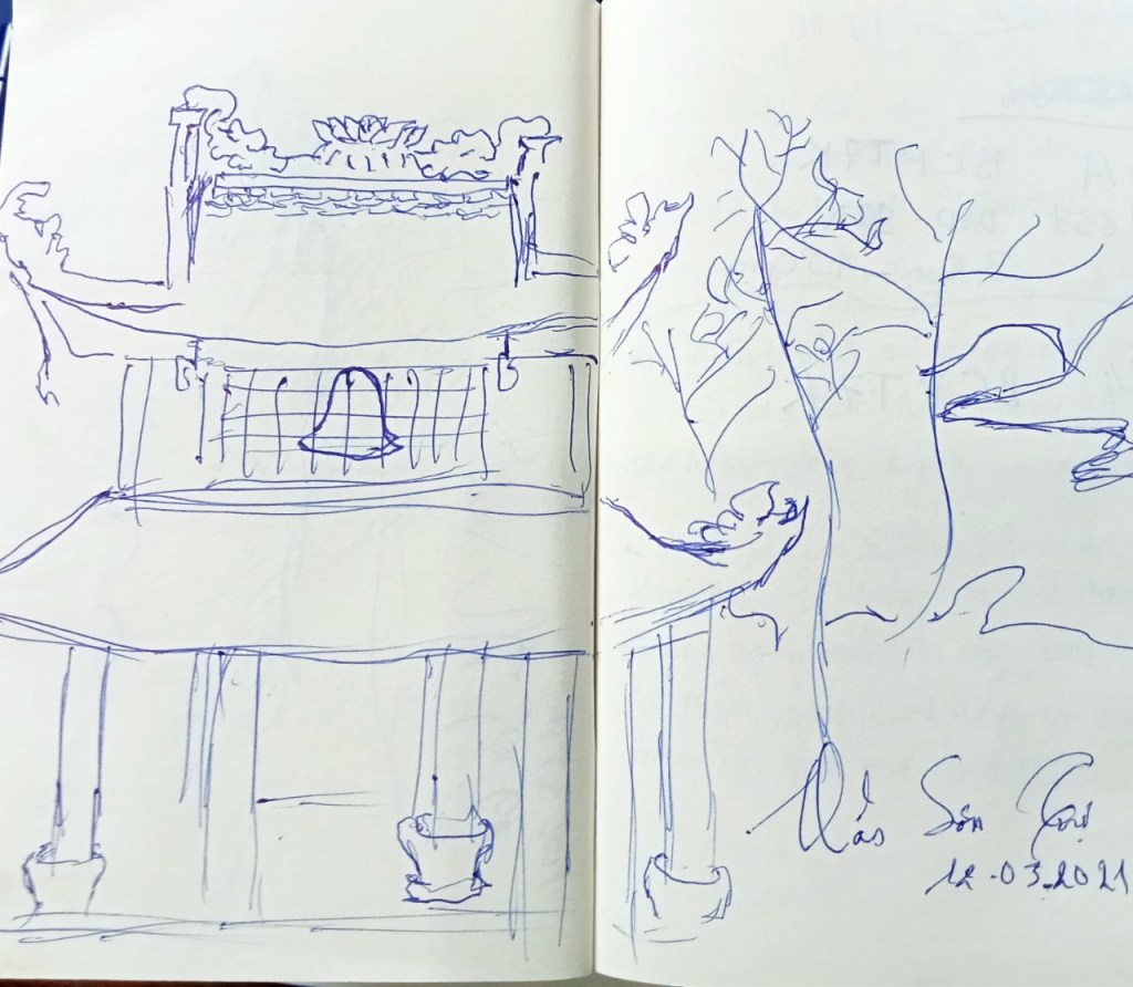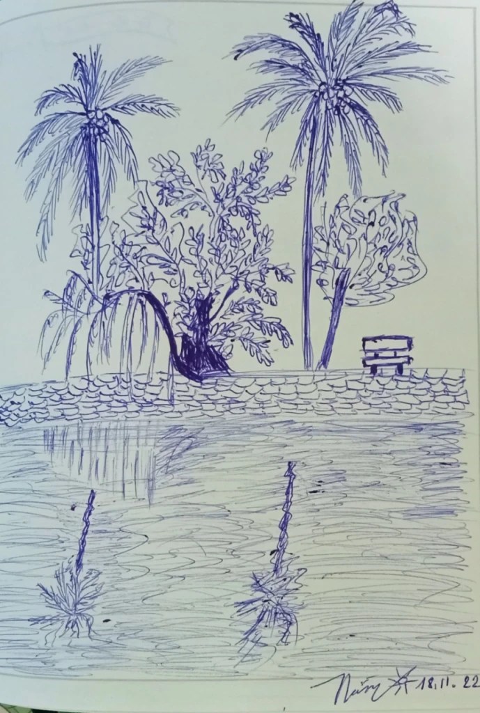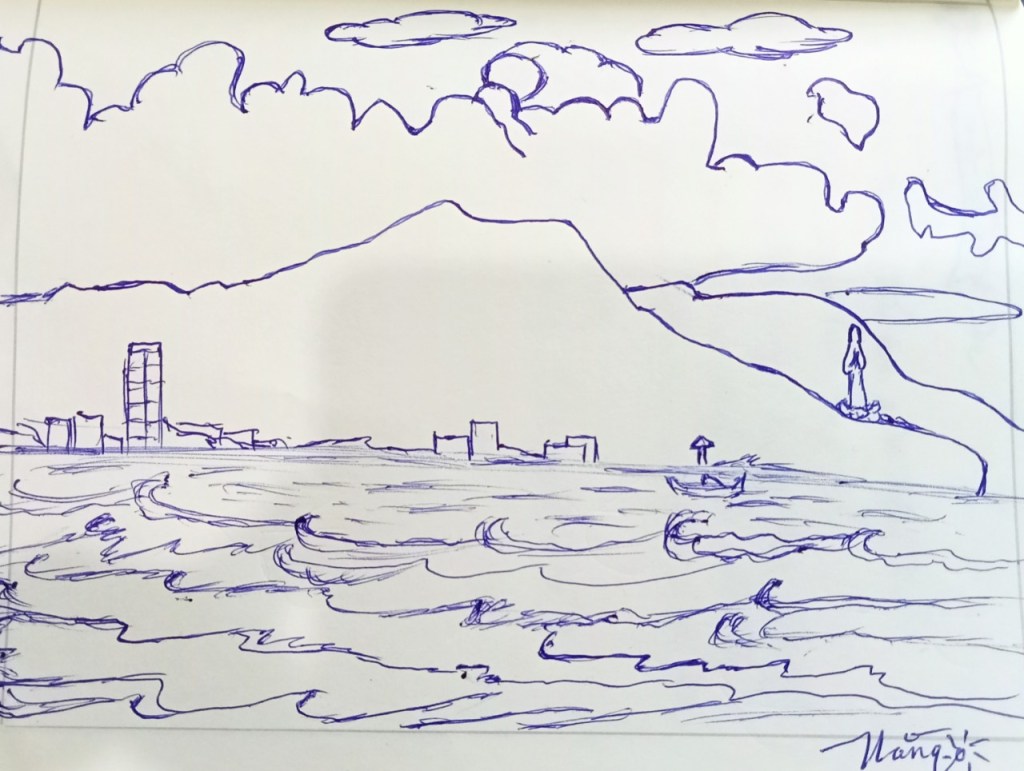 2,3 năm qua mình nhận ra mình kí họa bút bi khá nhiều. Lúc nào cũng mang theo cuốn sổ và cây viết bi nên tiện ở đâu có cảnh đẹp, trời xanh, cát trắng, nắng vàng, trăng thanh gió mát là lấy bút ra kí thí xác. Tổng kết lại thì cũng được cả một bộ sưu tập những khoảnh khắc đáng nhớ, những lúc tâm hồn nhẹ nhàng, bay bổng. Cứ thế, bình yên cho chuyến du ngoạn vào bên trong nỗi nhớ, bên trong bản thân, lặn sâu xuống đáy của yên tĩnh, bỏ mặc những ồn ào, lao xao vẫn đang tìm mọi cách lôi mình vào. Nhưng yên lặng, ko trả lời lao xao là tiếng nói của tâm hồn mình. Chỉ thích bình yên ❤