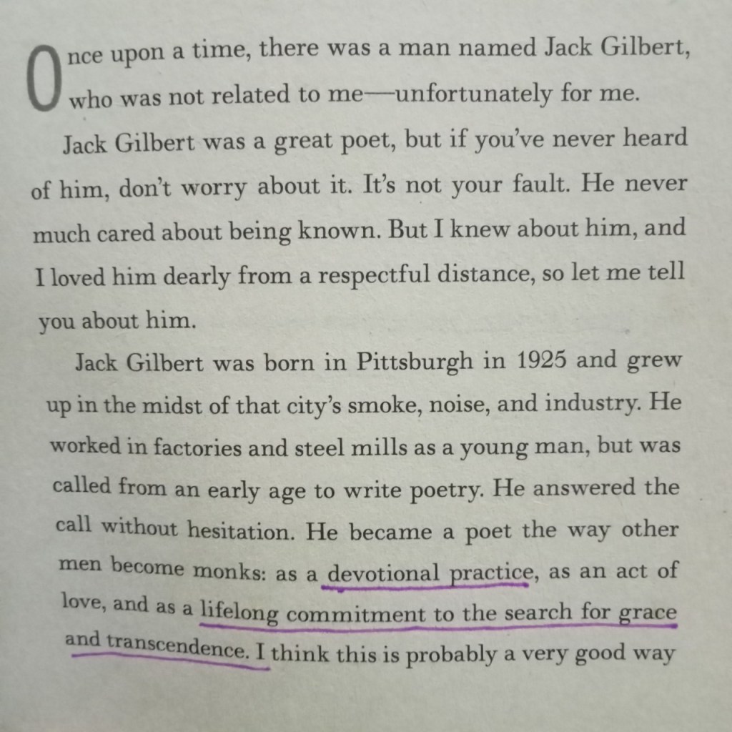 Mùi hương lan đêm mưa cũng làm tôi nhớ đến một câu chuyện về một người viết tên là Jack Gilbert được kể bằng giọng văn hóm hỉnh của nữ nhà văn cùng họ Elizabeth Gilbert. Bạn có thể tìm đọc về Jack trên internet, còn trong sách thì những đoạn Liz viết về Jack rất hay như sau: