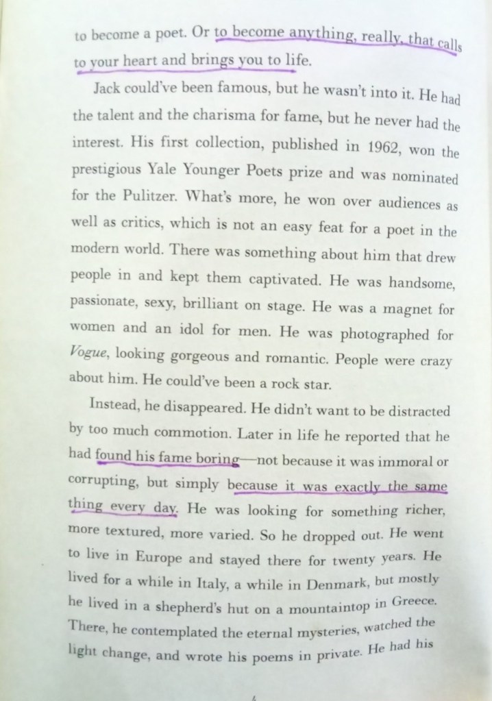 Tôi tin những gì Jack lựa chọn trải qua và thực sự đã trải qua là những sự tu dưỡng khó khăn và lớn lao: Ông ấy đã để cho tên tuổi của mình bị quên lãng đi ngay khi ông hoàn toàn có thể chọn sự nổi tiếng; ông ấy trải nghiệm và cho ra đời những tập thơ trong yên lặng ở những nơi xa xôi hẻo lánh nhất như “rare orchids with blooms seperated by many years”. Đơn giản với ông, chúng ta phải đương đầu với cả những điểm mạnh, những tốt đẹp của mình như với những điểm xấu xa và những điều chưa được. Chúng ta phải có sự cứng đầu và bản lĩnh để chấp nhận cả những tốt đẹp của chúng ta trong cái lò lửa nóng rát của cuộc sống này!