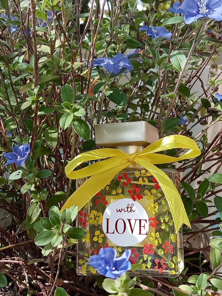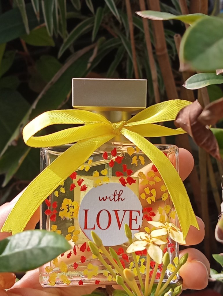 Đây là chai nước hoa sẽ định hình phần ngửi-nhìn cho những chai nước hoa Indie của Nắng: mùi hương đơn giản + trang trí vẽ tay + nhuộm màu nhẹ từ hoa lá tự nhiên ❤