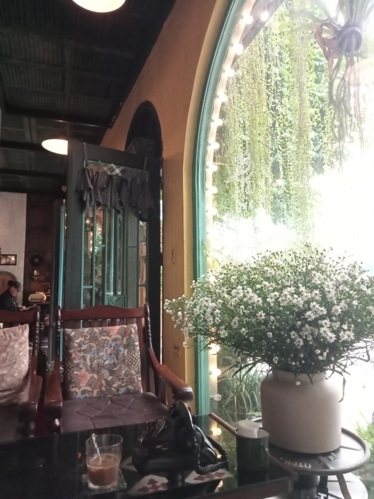 Nhưng bầu không khí Hà Nội lại xuất hiện rõ ràng và ngập tràn trong một quán cà phê vắng khách, được trang trí với rất nhiều vật dụng cũ kĩ (màu nâu tối), rất nhiều hoa Thạch Thảo chen nhau trong những chiếc bình gốm sứ. Hà Nội hiện hữu trong tiếng rít thuốc lào của anh chủ quán hoặc nhân viên khi thảnh thơi, trong tiếng nhạc tự sự sâu lắng được bật nhỏ đến mức không thể nghe thấy gì nếu 2,3 người bắt đầu trò chuyện…