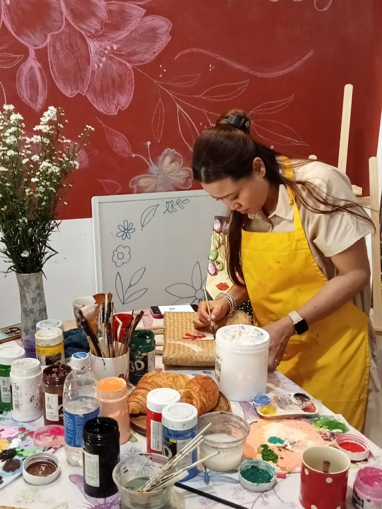 Một buổi chiều đầy nắng, Nắng cùng hai chị em bạn cùng sở thích vẽ vời, gặp nhau và đắm mình trong những nét cọ, thanh âm tĩnh lặng và thỉnh thoảng là những tiếng chị em trêu đùa nhau thích thú. Chị Hiền chợt hỏi: “hai em có biết khi nào phụ nữ hạnh phúc nhất không?”. Lúc đấy chị vừa dọn bánh mình mua đến kèm cafe chị tự pha ra nên mình trêu: “là khi có một người phụ nữ hạnh phúc mang đồ ăn ngon ra mời ạ ^^”. Chị cười lém lỉnh rồi bảo: không phải, phụ nữ hạnh phúc nhất là khi có chồng rồi và được làm những điều mình thích :).
