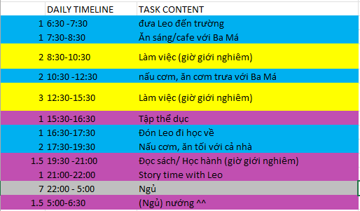 Đây là lịch trình điển hình của Nắng. Và khác với suy nghĩ của nhiều người, Nắng chỉ làm việc 5 tiếng/ngày và có 1.5 tiếng dành cho việc “ngủ nướng” (và một số sở thích “cẩm chướng” khác). Nắng có thể khẳng định: chất lượng công việc chẳng việc gì phải liên quan đến thời gian làm việc. Cụ thể là Nắng đã hoàn thành xong kế hoạch công việc đến cuối năm 2023.