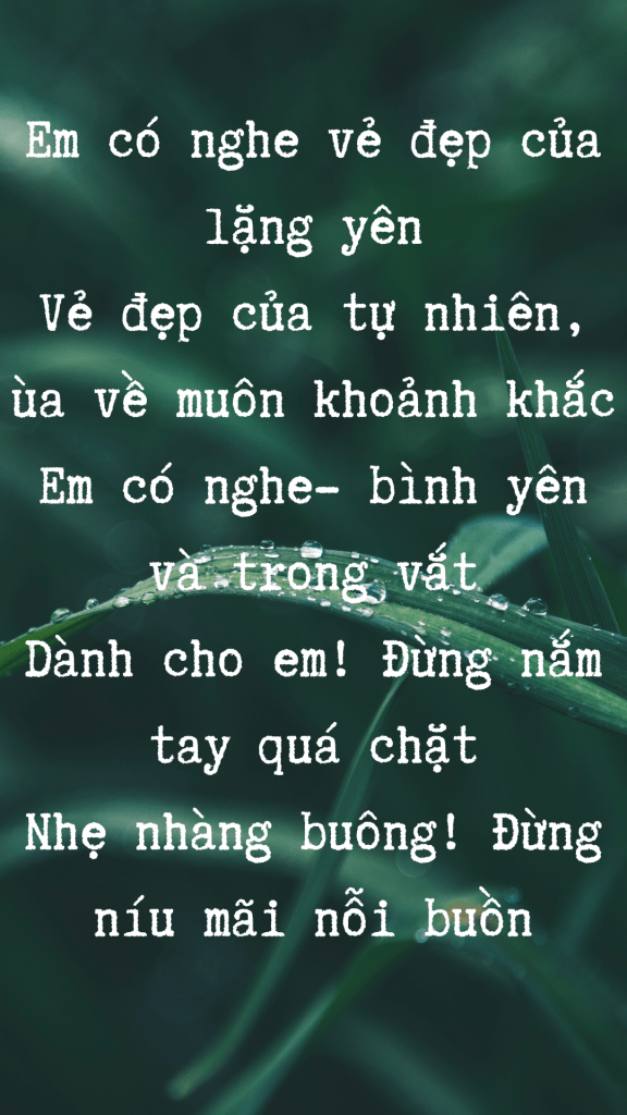 December 22, 2023 Nắng Vẻ đẹp của lặng yên Chậm nghe em, lặng và nghe lòng mình, em sẽ thấy… Hạnh phúc cũng biết buồn khi ở lại phía sau! Share this: Click to share on X (Opens in new window) X Click to share on Facebook (Opens in new window) Facebook Like Loading... Related