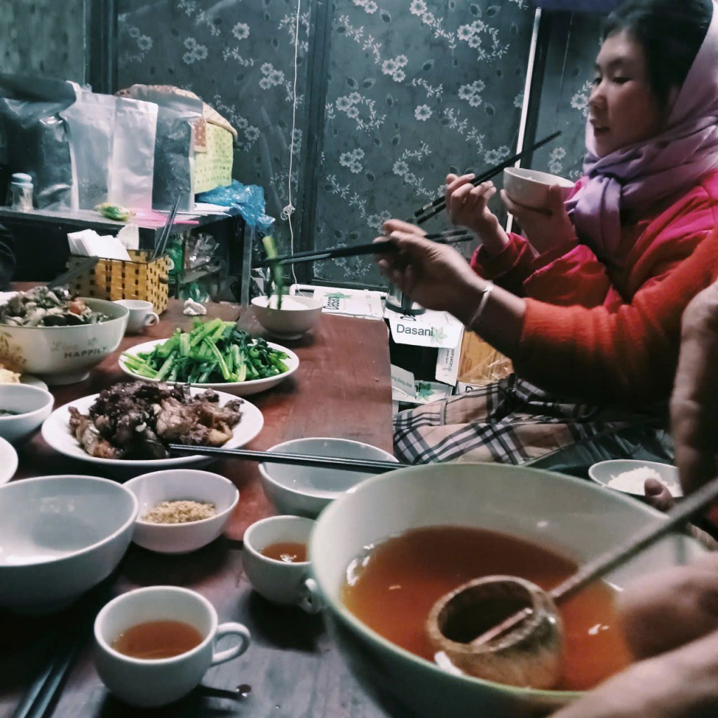 Đường nhỏ, xe đông và nhiều đoạn khó đi, Thào Chống đi từ 12h trưa mà đến 5h chiều mới tới Mộc Châu. Tôi thì vừa chờ vừa chill nên không sao, chỉ sợ em ấy sốt ruột và mệt. Tới nơi thì em ấy quay đầu xe đưa tôi đi Tà Xùa liền nhưng cũng mất 4 tiếng di chuyển chúng tôi mới tới nơi. Thào Chống đi rất cẩn thận và quen đường nhưng tôi cũng có nhiều phen “rớt tim” vì đường núi quanh co, hẹp, có nhiều đoạn sương mù xuống dày đặc, không thể thấy gì! Nhiều lúc tôi thấy mình như…uống thuốc liều – một mình ngồi xe với một người đàn ông lạ, di chuyển trên cung đường khá nguy hiểm vào ban đêm. Trải nghiệm này làm tôi nhớ lại lúc một mình đi du lịch Lào và cả Fiji cách đây hơn 10 năm. Hồi đó hay bây giờ vẫn vậy, tôi luôn chọn đặt niềm tin vào những người dân bản địa và tôi đã đúng, trái tim họ ấm áp và nhiệt thành…Trên xe thỉnh thoảng tôi nghe Thào Chống nói chuyện cùng các anh em lái xe khác để hỗ trợ nhau trong việc di chuyển và phục vụ khách. Họ gọi nhau là anh em và ứng xử với nhau như những người anh em thật sự; không cạnh tranh, chửi bới như không khí kinh doanh ở dưới xuôi…Một bầu không khí rất nhẹ và lành dù tôi không hiểu một từ tiếng H’Mông họ đang nói với nhau. Tôi nhớ cái không khí này của những người dân vùng cao – điều mà tôi đã được hít thở và lớn lên cùng trong những năm tháng tuổi thơ ở Kon Tum…