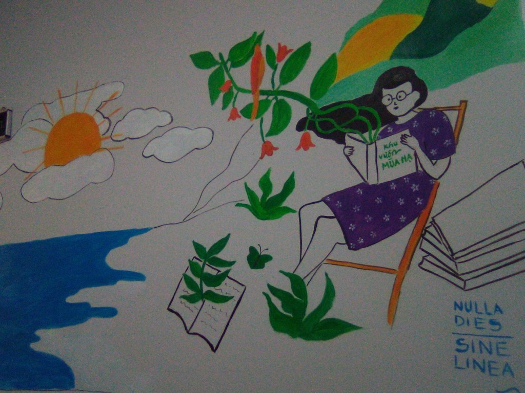 5 năm rồi, ngày nào cũng như ngày nào, rảnh là bôi…Ba bảo: “nhà người ta có họa sĩ, còn nhà mình có bôi sĩ”. Thời gian thì nhanh lắm, thấm thoát thoi đưa…5 năm nhìn lại, các mảng tường đã được phủ gần kín bởi màu sắc, bởi những giấc mơ hão huyền, bởi những mảng ký ức lúc day dứt khi mênh mông…tất cả đã dệt nên một ngôi nhà tâm hồn như một vườn hoa lá, rộn tiếng chim ca và xào xạc tiếng lá rơi…