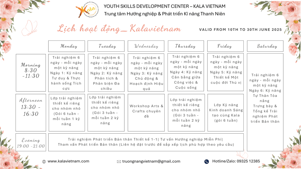 Chào bạn đến với không gian phát triển bản thân tại Kala Việt Nam — nơi mỗi tuần là một hành trình rèn luyện kĩ năng, khai mở năng lực sống tích cực, chủ động và sáng tạo!