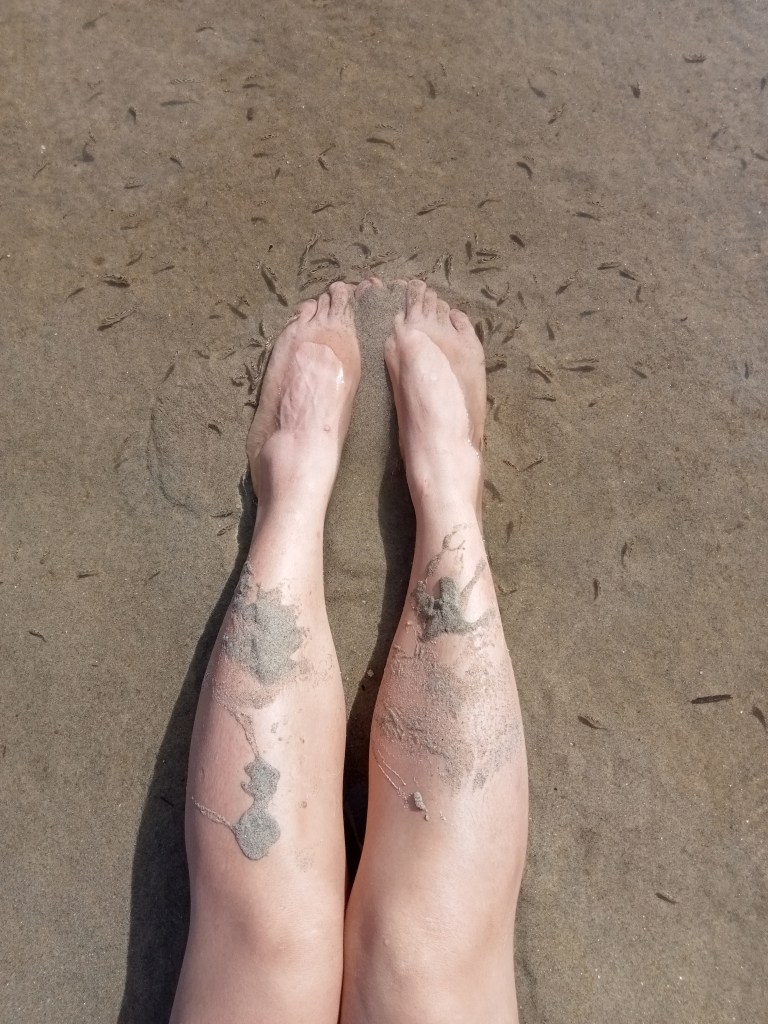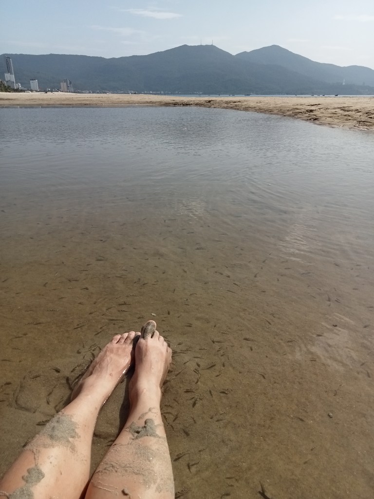 Mình ngồi ngâm chân ở một vũng nước nơi mùa này có rất nhiều lũ cá biển sọc trắng đen, lanh lợi, hóm hỉnh, thích làm “massage chân” cho người. Hồi xưa dẫn Ba Má đi Singapore chơi, mình có cho Ba Má trải nghiệm màn “massage cá” này rồi nhưng đó là họ cho rất nhiều cá vào những cái chậu rồi khách cho chân vào và cá rỉa làm massage. Còn đây ở bãi biển Đà Nẵng mùa này bạn có thể trải nghiệm massage cá hoàn toàn tự nhiên nhé…cứ thong thả mạnh dạn cho chân xuống, chỉ vài giây sau là cả đàn tới “tẩy tế bào chết” giúp bạn ngay. Nhìn loài cá này có nét gì đó rất vui vẻ, thư giãn và thỉnh thoảng chúng làm bạn cười khúc khích vì…nhột lắm ^^