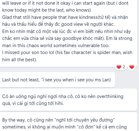 …có những ngày mình ko kiếm đc đồng nào, thậm chí còn trả tiền để đồng hành và hỗ trợ sự phát triển của các bạn trẻ nhưng đó là những lúc giá trị của mình được thực hiện. Mình làm giáo dục để được thấu hiểu và ở bên cạnh động viên, nói với các bạn: mọi việc sẽ ổn thôi, con/em làm tốt mà. Can đảm lên nào chàng trai, cô gái! Cứ vậy thời gian trôi đi…các chàng trai cô gái nhỏ lớn dần và bay đi…