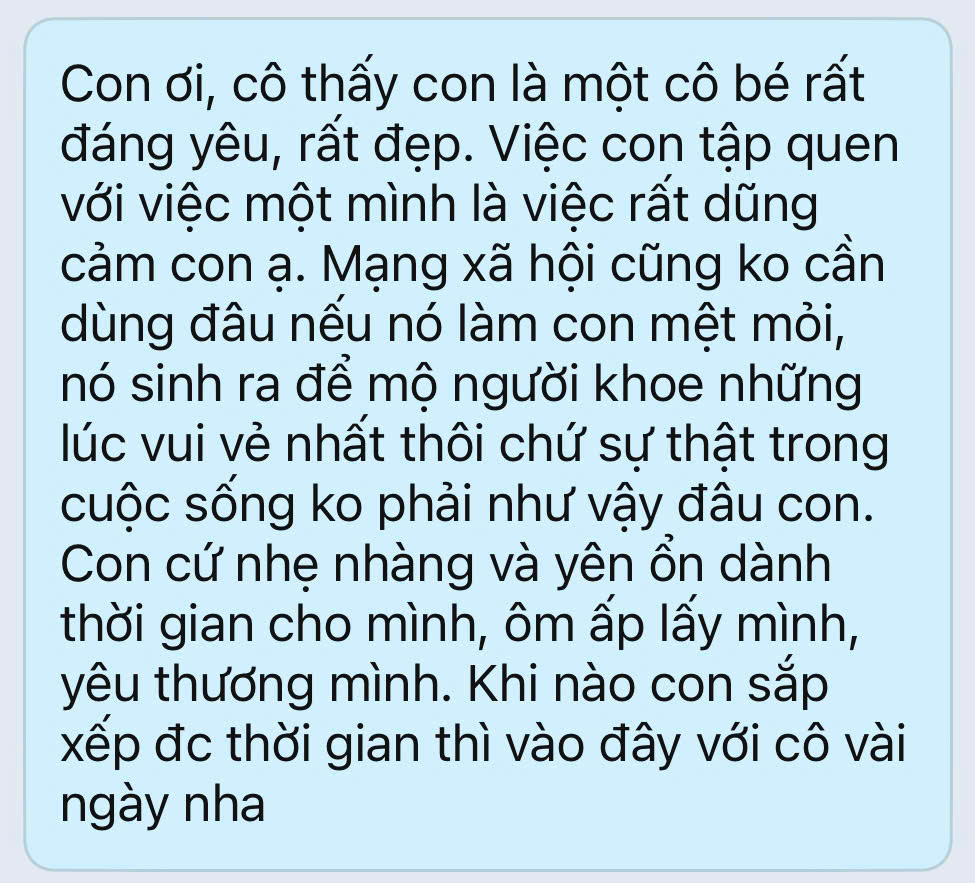 Đôi lúc nhận được tin nhắn của các bạn, Cô không biết phải nói gì cả, những giọt nước mắt cứ trào ra…Cô biết nói làm sao trước những câu hỏi, những hoang mang, những nỗi sợ…mà đôi khi các bạn không còn có thể biết nó bắt nguồn từ đâu và như thế nào nữa…