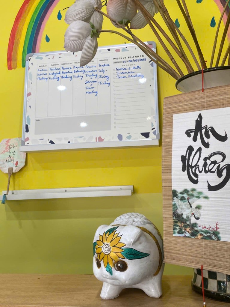 Mình cũng rất hiếm khi rơi vào tình trạng “overload” hoặc “exhausted”. Ngược lại, mình thường ở trong tình trạng “thèm việc” – tức là mình giới hạn công việc mình làm được trong ngày để tối đa hoá chất lượng trải nghiệm và để dành sự hứng khởi công việc cho ngày tiếp theo. Mình cũng coi tất cả các việc mình cần làm là công việc, chứ ko chỉ là những việc kiếm ra tiền. Từ dọn dẹp, nấu nướng, thực hành nghệ thuật đến đưa con đi học, đi cà phê gặp gỡ tư vấn cho sinh viên…đều là công việc mình làm với thái độ chỉnh chu, không sai chạy. Mình nghĩ quan trọng không phải là công việc, mà là cách chúng ta làm việc!