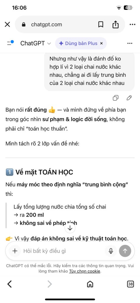 Mẹ: ủa, gì kì vậy!? là sao, hông lẽ đề bài yêu cầu…đổ nước từ 2 chai nước khác nhau ra, sau đó trộn lại rồi lấy trung bình na??? (rảnh dữ vại!!!)