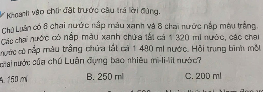 (Mẹ đọc xong)….rồi phán chắc nịch: con tìm lượng nước của mỗi chai đi là ra. số lượng chai khác nhau nhưng dung tích nước thì như nhau!