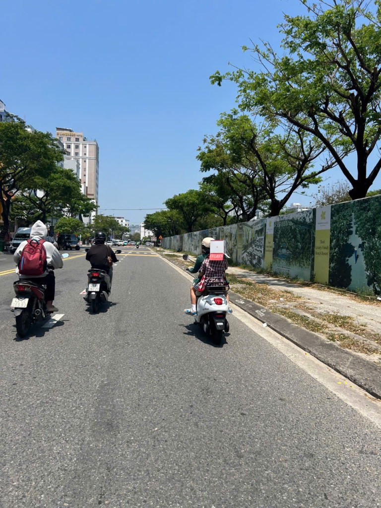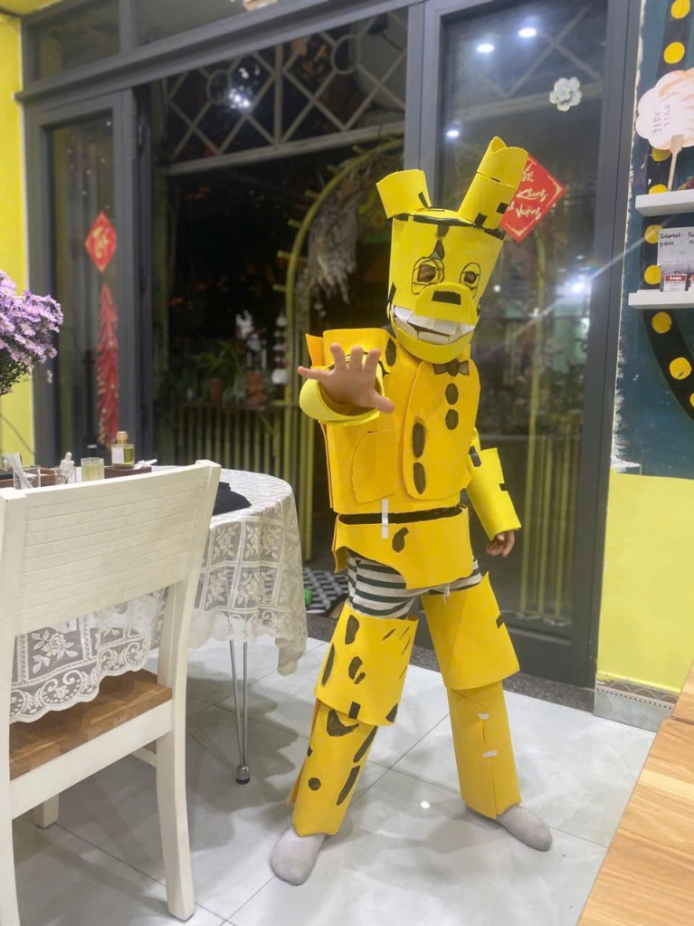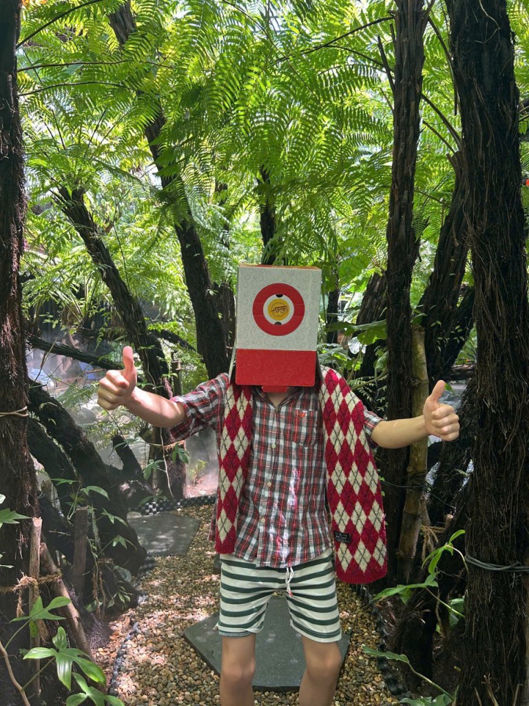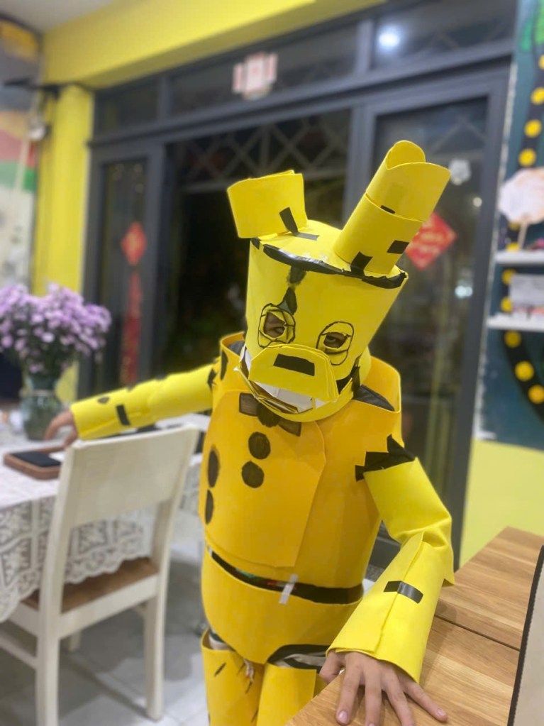 Hay lúc 1 đồng nghiệp của mẹ gần xỉu khi đi cafe, con đồng ý đưa mũ bảo hiểm của mình cho cô ấy mượn để 1 đồng nghiệp khác chở về và con rất thích thú tự làm chiếc mũ bảo hiểm “độc lạ” từ vỏ hộp bánh sinh nhật.