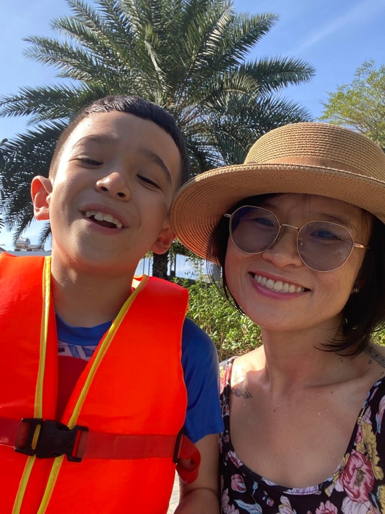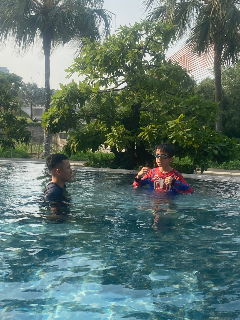 Nắng đang tận hưởng năm thứ 10 được đồng hành cùng con. Và chưa bao giờ thấy việc đồng hành tập bơi với con lại sung sướng và nhàn hạ thế này. Sao trước giờ không nghĩ ra nhỉ – chỉ việc tìm một thầy dạy bơi, chở con tới bể bơi cho con học; còn mình thì bơi lội nhẹ nhàng, tắm nắng và thư giãn (chứ cái “nightmare” dạy bơi cho con thật ám ảnh!)